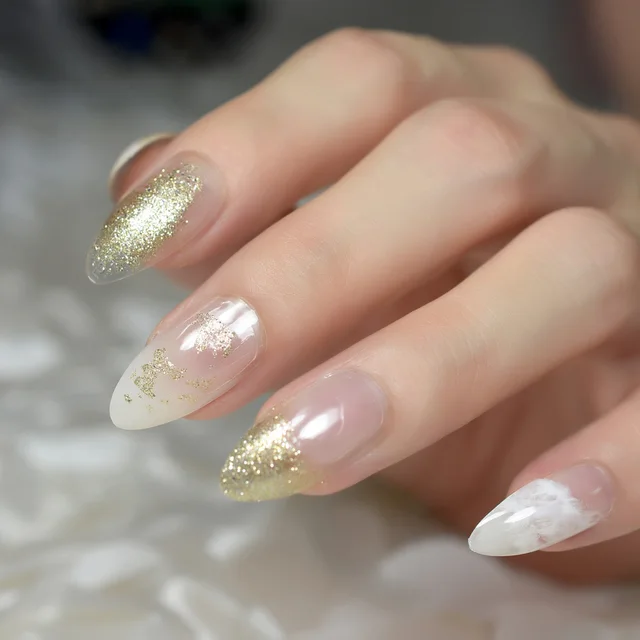 Pointed Stiletto White Jade French False Nail Art Tips Gold Glitter Clear Oval Almond Fake Nails Press Daily Wear Finger Tips False Nails Aliexpress