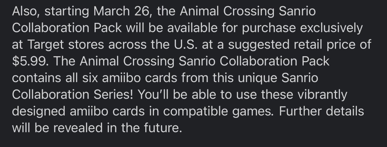 Sadly they made these exclusive to TARGET a multinational corporation. Over the past two months Nintendo has been promoting Sanrio amiibo cards for Animal Crossing New Horizons on the Switch console. No more Animal Crossing.